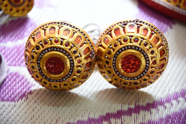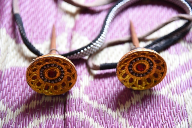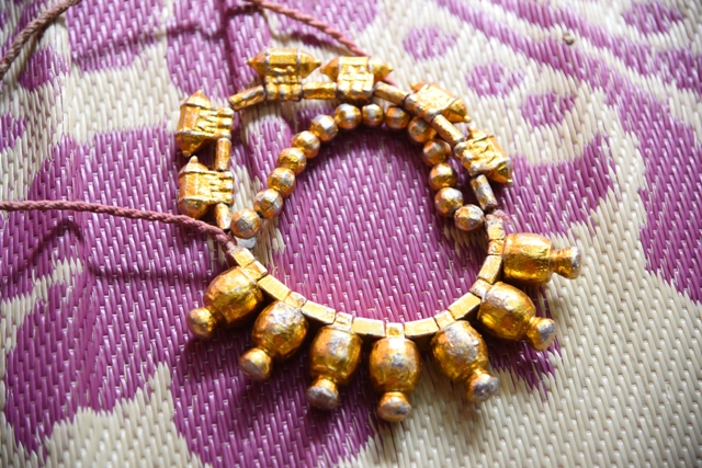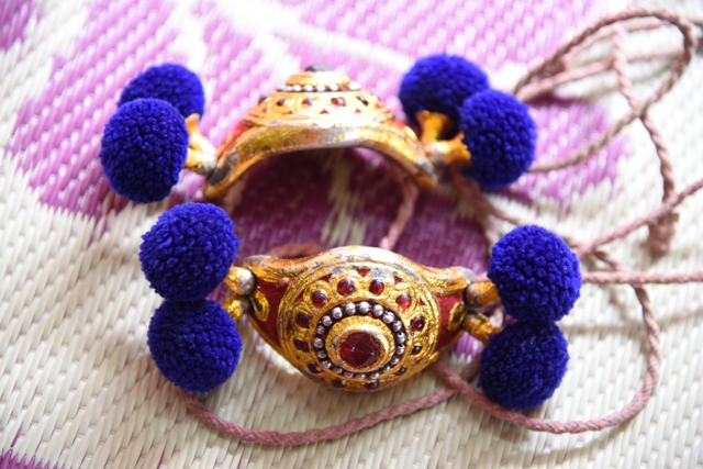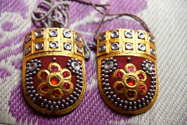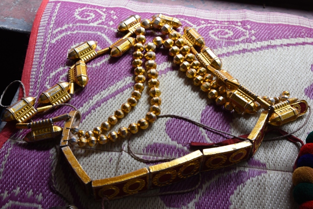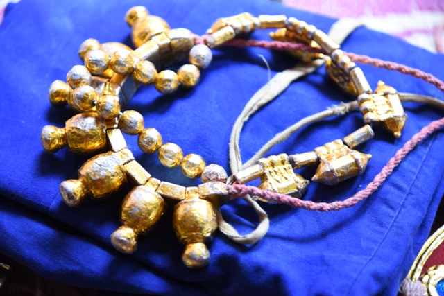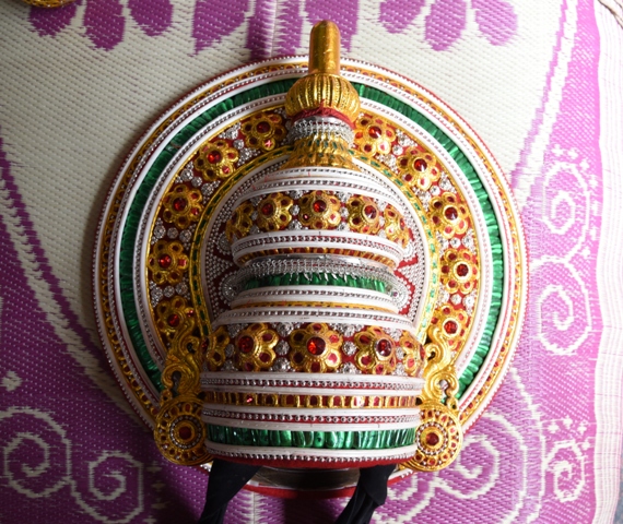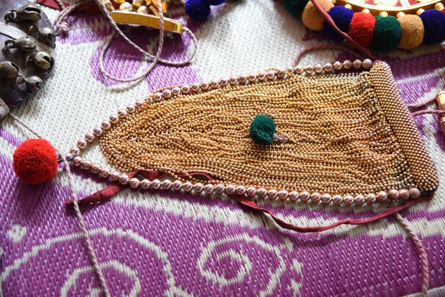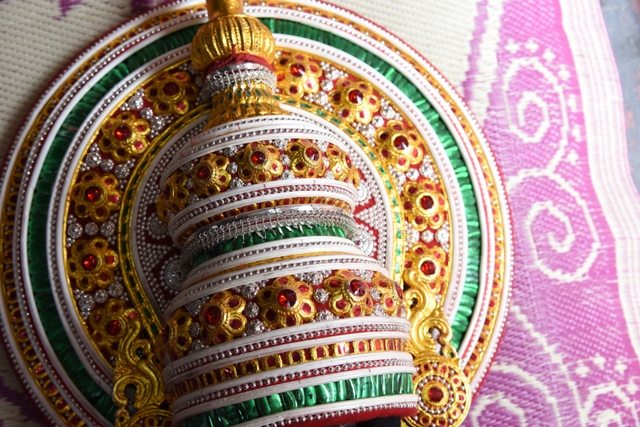 Each artist performing Kathakali wears ornaments full of beads over the shoulder.