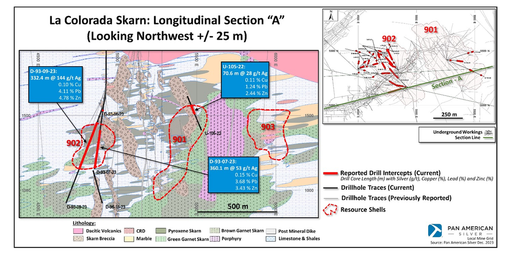 • More than 280,000 metres have been drilled on the project, with 97,000 metres completed since the last mineral resource update issued on September 14, 2022. Recent drilling has focused on the 902 skarn zone with 24 infill drill holes, which follow up on mineralisation reported in prior news releases dated May 2, 2023, November 1, 2022, and July 21, 2022. Results confirm wide zones of high-grade silver mineralisation, as demonstrated by 332.40 metres at 144 g/t Ag, 4.11% Pb and 4.78% Zn, including 89.85 metres at 461 g/t Ag, 10.63% Pb and 11.05% Zn (drill hole D-93-09-23).