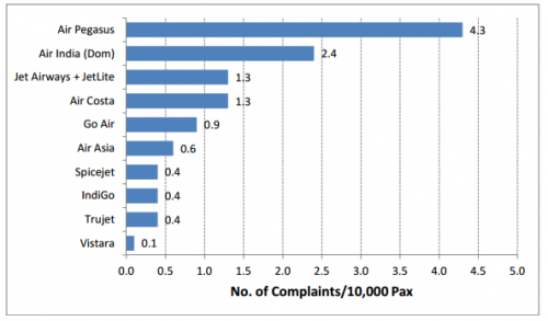 Most of the complaints are received on Air Pegasus Airlines (4.3 per 10,000 passengers carried) and Lowest complaints is on Vistara (0.1 per 10,000 passengers carried).