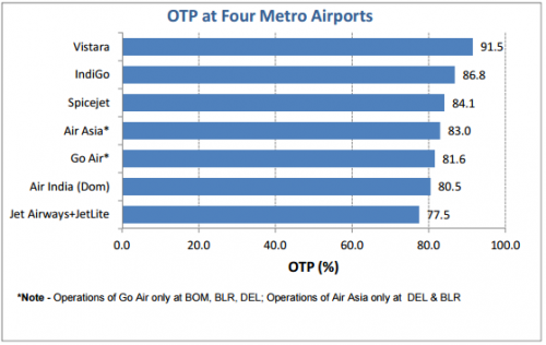 On-Time Performance (OTP) of scheduled domestic airlines has been computed for four metro airports viz. Bangalore, Delhi, Hyderabad and Mumbai. Airline-wise OTP at four metro airports for the month of March 2016 is as follows: