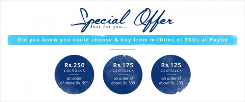 - Get cashback of Rs.250 on orders above Rs. 999, Rs.175 on orders above Rs.599 and Rs.125 on orders above Rs.299.