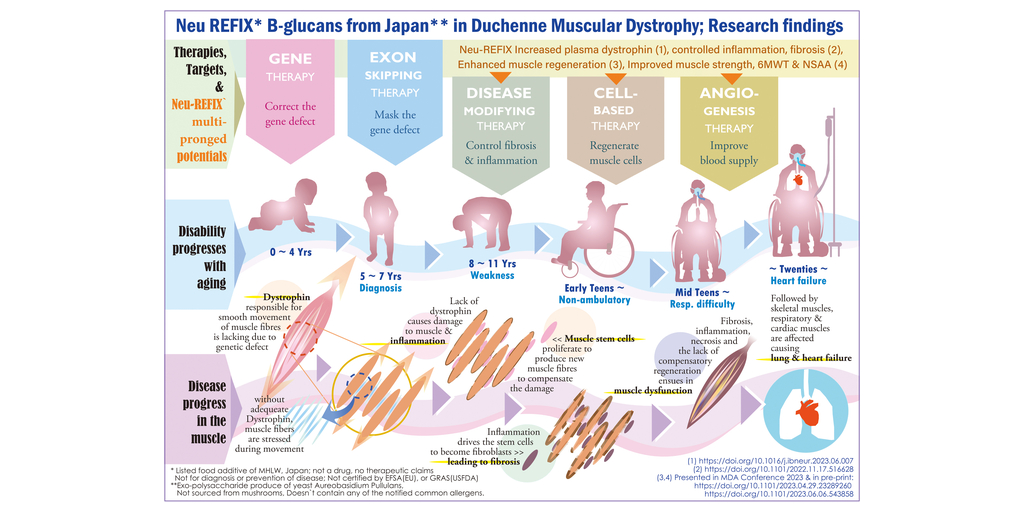 Neu-REFIX is an allergen-free ß-glucan, unique for its source, as an exo-polysaccharide from Aureobasidium Pullulans, produced in GMP certified facility in Japan, possessing purity, functionality, water solubility and dosage standardization like a drug, preservable at room temperature, and orally consumable as such or with food. Immune modulatory effects in pre-clinical studies, in healthy Japanese volunteers and Covid-19 patients, showed its potentials as a disease modifying adjuvant, worth undertaking clinical trial in DMD, to yield beneficial effects by controlling inflammation and fibrosis.