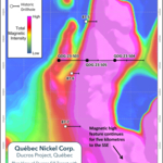 The digital Qu�bec government geology for QNI�s Ducros project area, as sourced from the SIGEOM database, indicates the ultramafic intrusion in which the Ducros Sill target is included spans from approximately 500 metres north of the most recent drilling to approximately five kilometers to the south-southeast (Figures 1). Modelling of the VTEMTM and drone magnetic data collected by QNI during its 2022 exploration program supports this interpretation (Figure 4). There is no record of this multi-kilometer-long magnetic high feature being exposed at surface or having ever been drilled beyond what Abitibi Resources completed in 1987. If this geophysical anomaly is an expression of a serpentinized ultramafic/dunite intrusion, as currently hypothesized, it would rival the size of other high-profile large tonnage nickel-cobalt projects currently being advanced in the Abitibi Greenstone Belt.