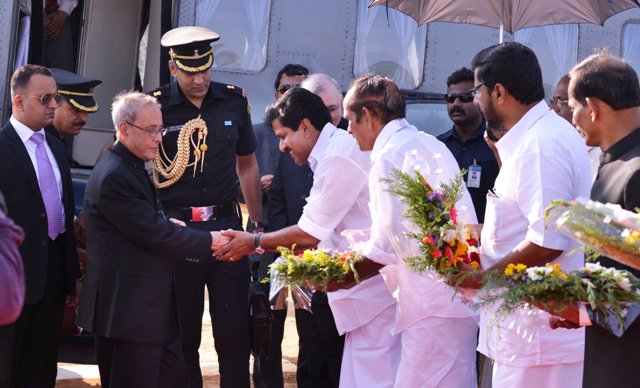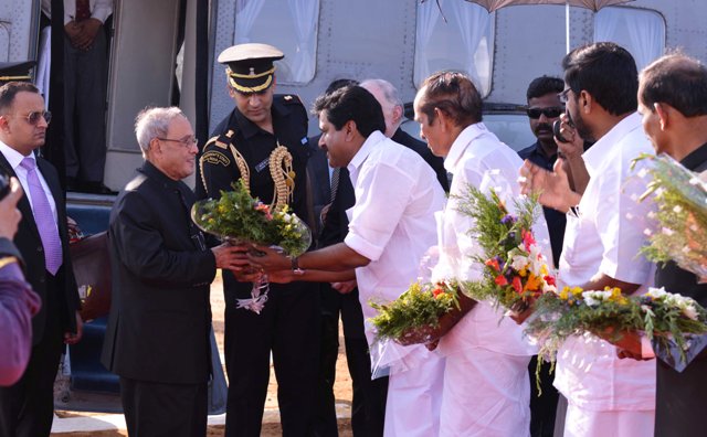 The President, who landed at the helipad on Sreekrishna College campus at Ariyannur, was received by Devaswom Minister V.S. Sivakumar.