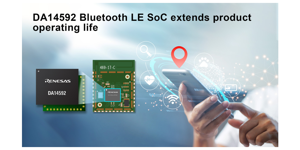 TOKYO–(BUSINESS WIRE)–#BluetoothLE–Renesas Electronics Corporation (TSE: 6723), a premier supplier of advanced semiconductor solutions, today introduced the DA14592 Bluetooth® Low Energy (LE) System-on-Chip (SoC) representing Renesas’ lowest power consumption and smallest, multi-core (Cortex-M33, Cortex-M0+), Bluetooth LE device. By carefully balancing tradeoffs between on-chip memory (RAM/ROM/Flash) and SoC die size (for cost), the DA14592 is very well suited to a broad range of applications including connected medical, asset tracking, human interface devices, metering, PoS readers and ‘crowd-sourced location’ (CSL) tracking.