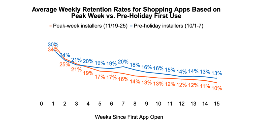 Despite the peak growth opportunity and overall importance of apps, the two cohorts exhibit a similar retention pattern, suggesting retailers don’t treat peak-week app customers any differently from pre-holiday customers — despite the holiday frenzy’s urgent, transactional focus. Essentially, retailers allow peak-week customers to remain transactionally focused, which is reflected in lower retention rates before Christmas has even arrived. In addition, both cohorts see 38% of new users only open the app once within the analysis time frame (Week 0), helping to account for the Week 1 retention rate.