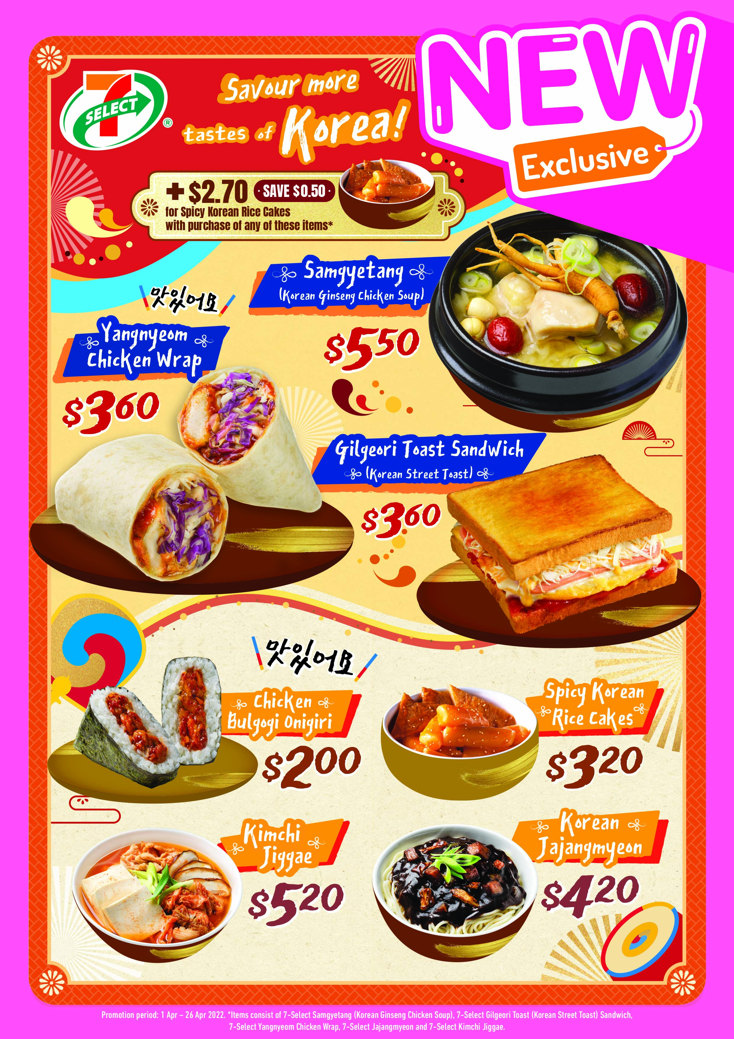 | 7-SELECT Samgyetang (Korean Ginseng Chicken Soup) | $5.50 | Get $0.50 off 7-SELECT Korean Spicy Rice Cakes with purchase of 7-SELECT Samgyetang/ Gilgeori Toast/ Yangnyeom Chicken Wrap | 1 Apr � 26 Apr 2022 | 31 Mar 2022 |