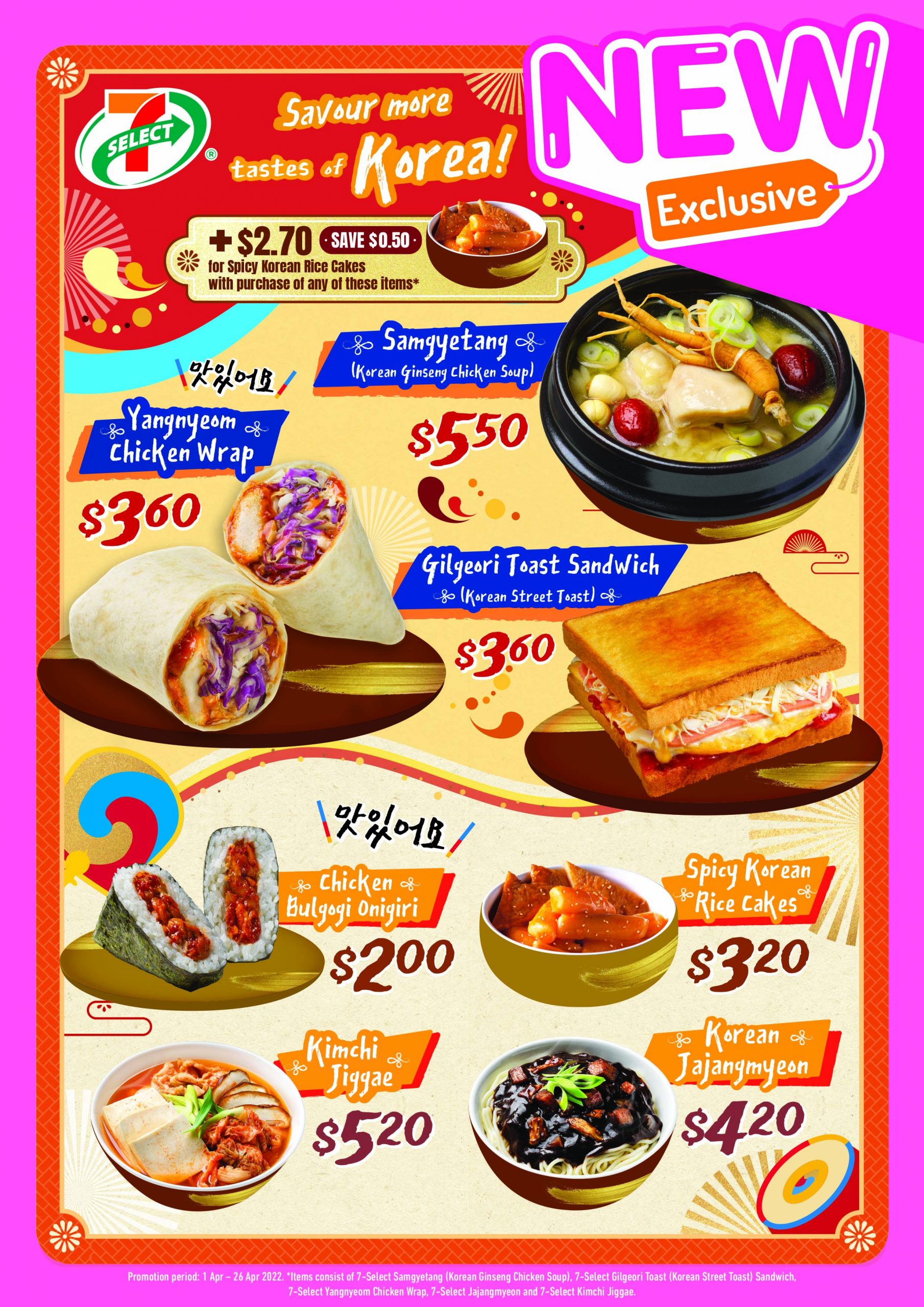 | 7-SELECT Samgyetang (Korean Ginseng Chicken Soup) | $5.50 | Get $0.50 off 7-SELECT Korean Spicy Rice Cakes with purchase of 7-SELECT Samgyetang/ Gilgeori Toast/ Yangnyeom Chicken Wrap | 1 Apr 26 Apr 2022 | 31 Mar 2022 |