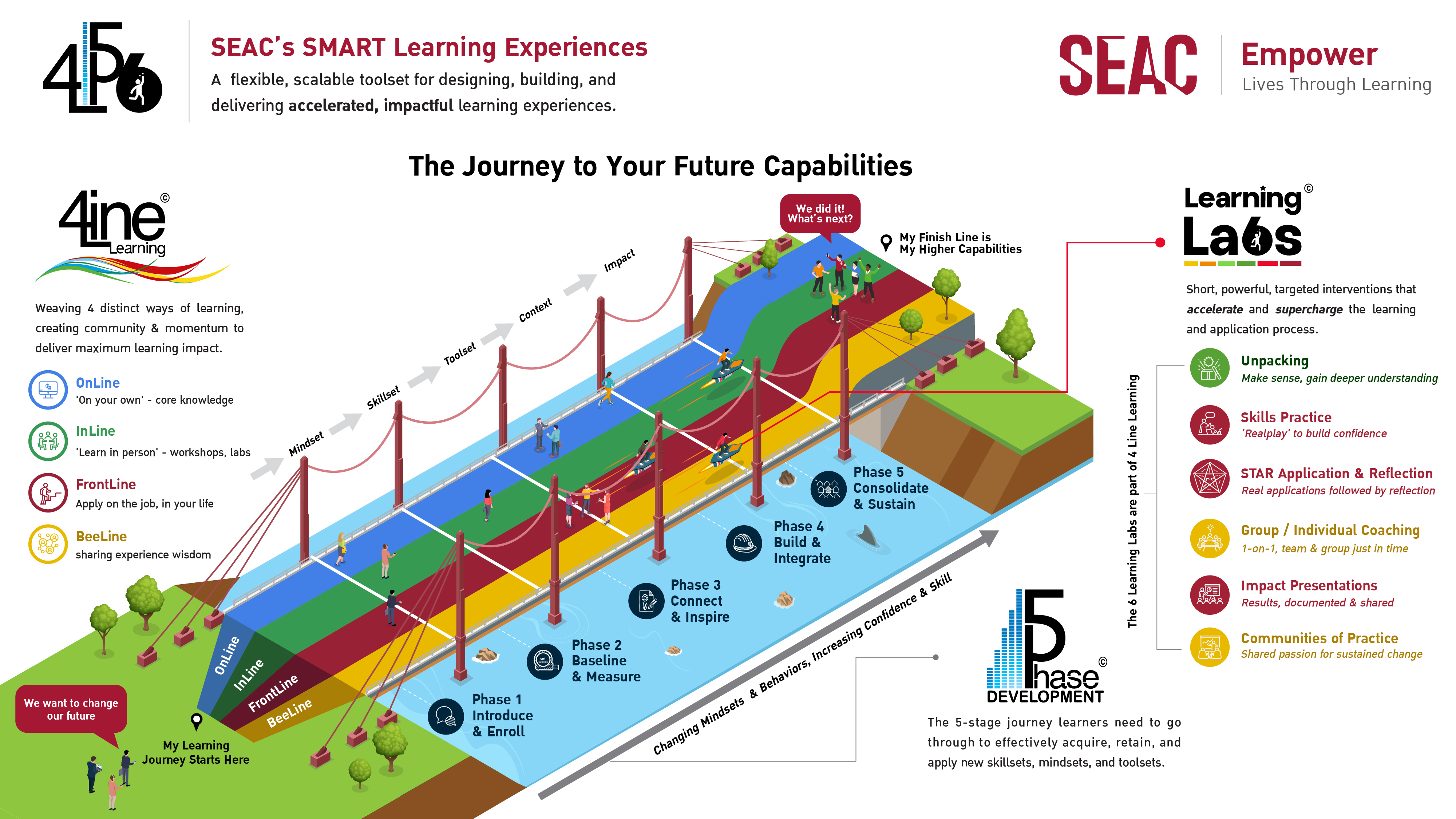 The solution begins with defining the five phases that a learner must go through to ensure buy-in, value, retention, and application: essentially, a bridge across their skill gap. Following that, SEAC weaves four distinct learning lines to support the learners in crossing that bridge to their future. Finally, SEAC incorporates targeted lab experiences to assist learners in accelerating and applying their new skills with confidence and impact. SEAC’s 4-Line Learning, 5-Phase Development, and 6 Learning Labs are a technology-enabled ecosystem and toolkit for effectively closing the massive skill gaps learners’ face.