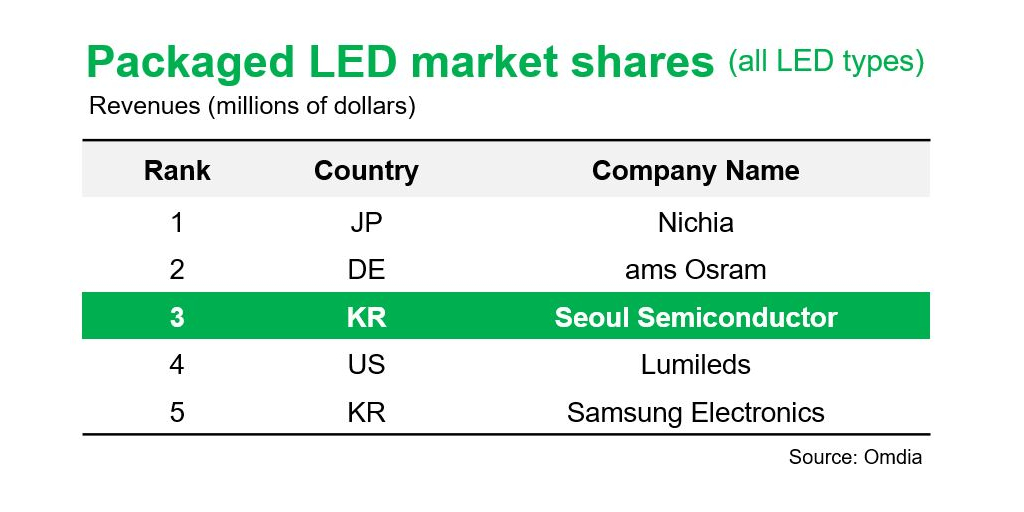 SEOUL, South Korea–(BUSINESS WIRE)–#Acrich–According to TrendForce’s “2022 Global LED Lighting Market Analysis” and the database released by Omdia, Seoul Semiconductor Co., Ltd. (KOSDAQ:046890), a global optical semiconductor company, has ranked third in the global market and first in Korea, which is a reflection of the company’s remarkable accomplishments of over 18,000 new technology patents.
