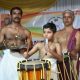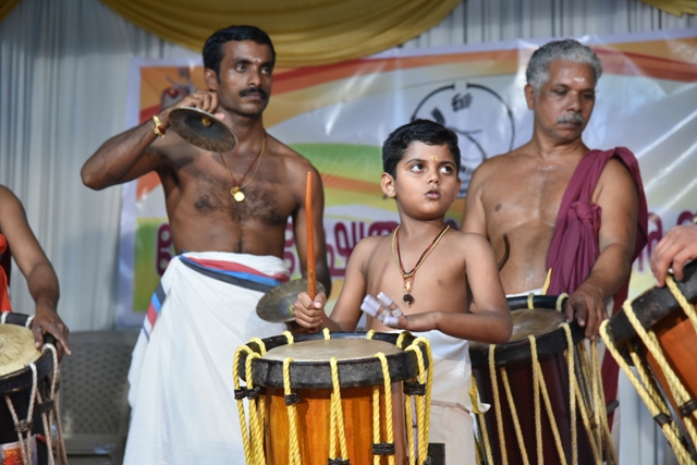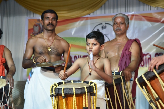 In which the main player at the centre improvises rhythmically on the beats of half-a-dozen or a few more chenda and ilathalam players around.