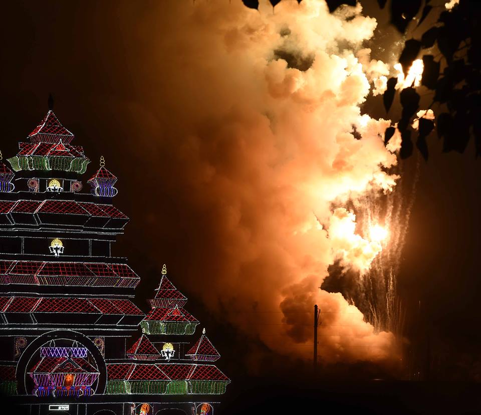 It is the second biggest fireworks after Nenmara Vallangi Vela. The most spectacular show during the Pooram is the magnificent and thunderous fireworks that takes place during the early morning hours of succeeding day (typically at 4:00 am). The fireworks is of a class of its own among such fireworks shows of Kerala temple festivals. The peculiar landscape (of being a low valley surrounded by many hills) adds extra reverberation and reinforcement to the already well-engineered explosive sounds produced. The show is enjoyed by tens of thousands of people gathered from various parts of the state. Nenmara Vallangi Vela is also celebrated like poorams and it is famous for the fireworks (Vedikkettu).