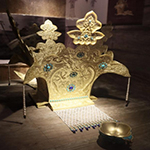 Through research, the exhibition reproduces the gilt-silver crown with 3D modeling. The main body of this crown is mainly made of four pieces of gilt silver with turquoise inlaid. The crown surface combination is in a square bucket shape. The bottom surface of the crown is square, with each side 17.5 cm long, the top 37 cm high, and the maximum width of 36.5 cm. The pattern on the front and back is 2 dragons frolicking, with a phoenix standing on a lotus pedestal on each side. The neck guard pattern on the back is a pair of lions facing one another. The interior of the crown is made of brocade and silk, and there is a network of pearls in front of the crown, which may be the same as that of the emperors of the Central Plains.