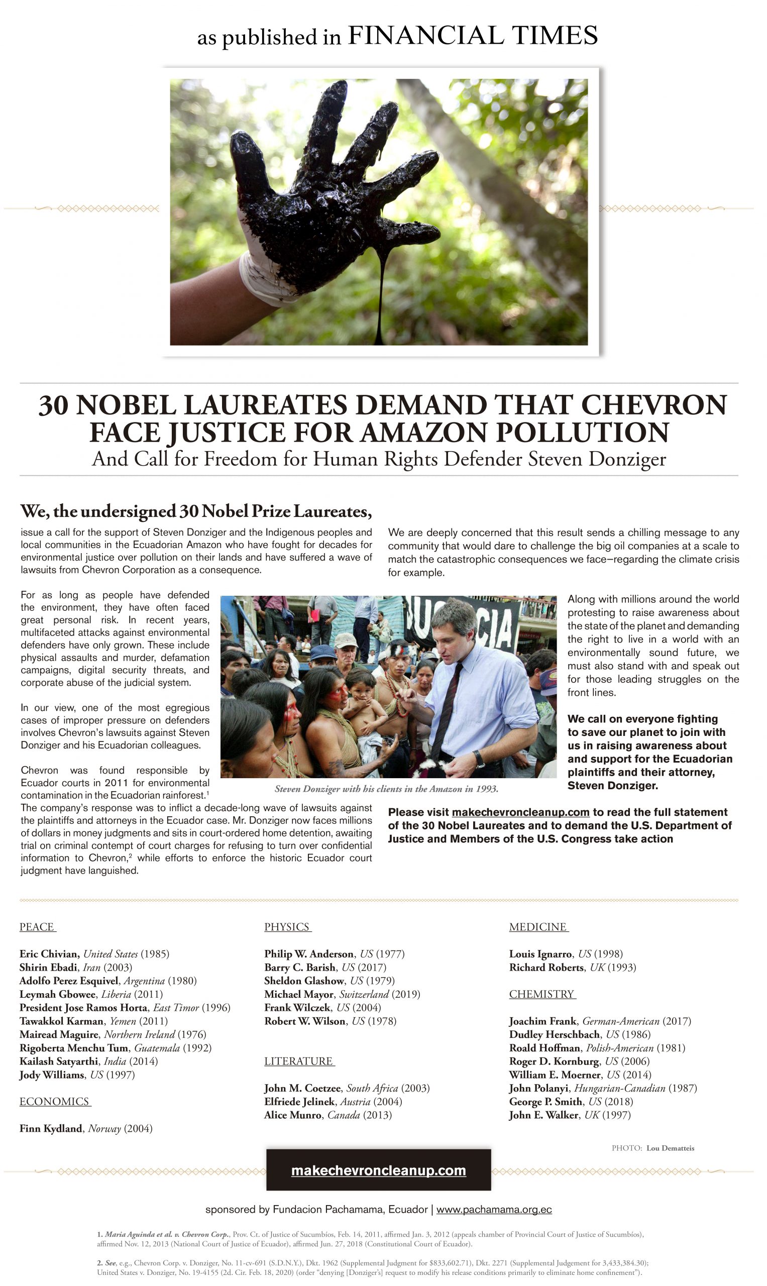 NEW YORK, US – Media OutReach – April 17, 2020 – On April 16 2020, Nobel laureates, including Peace laureates and winners in Medicine, Chemistry, Physics, Economics and Literature, will announce they are calling for the release of human rights lawyer Steven Donziger from house arrest. Donziger helped rainforest communities win a landmark judgment against Chevron for polluting the Amazon in Ecuador, and he has been targeted by Chevron with a vicious retaliation campaign. He has been under house arrest for over 250 days in New York City, in part for refusing to hand over confidential case files and client communications to Chevron. It’s thought to be the longest pretrial detention for a contempt charge for a lawyer in U.S. history.