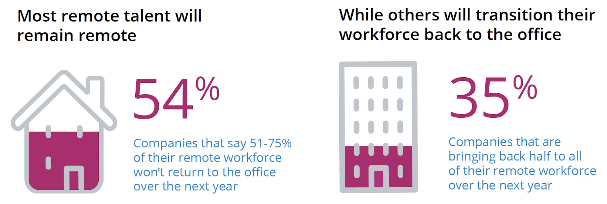 More than 1,000 U.S. and UK tech company decision-makers participated in the study and 72% say their business utilizes a substantial distributed workforce; 59% say more than half of their workforce is remote, and 61% of U.S. tech leaders report more than half of their remote workers will remain that way for the foreseeable future.