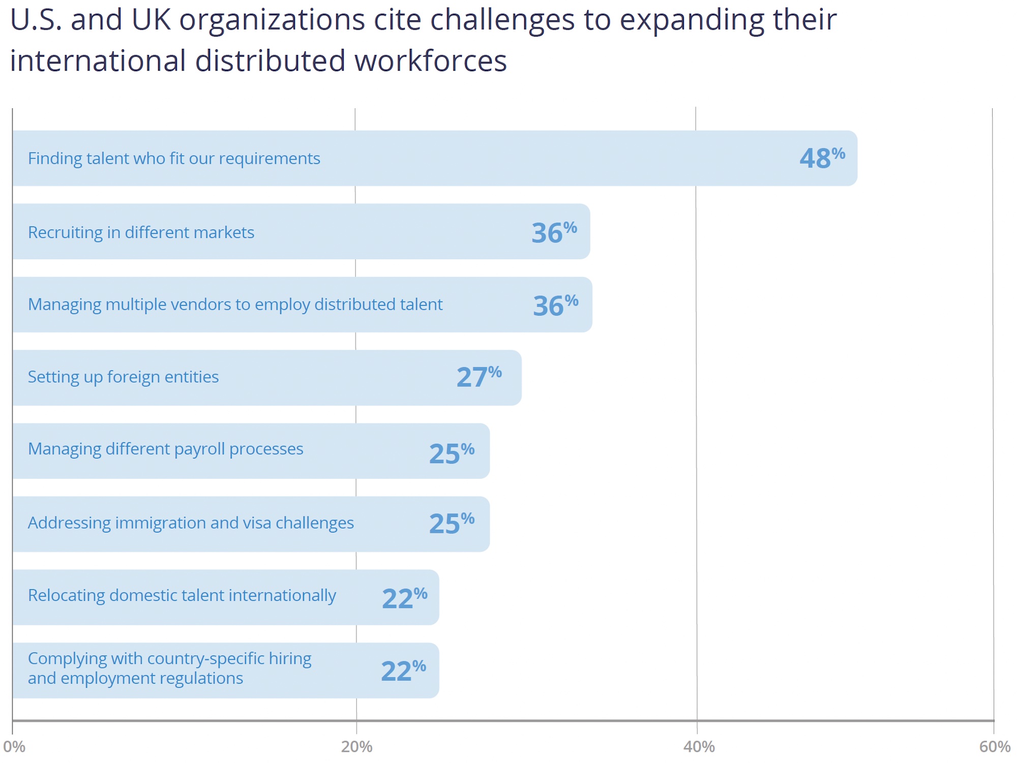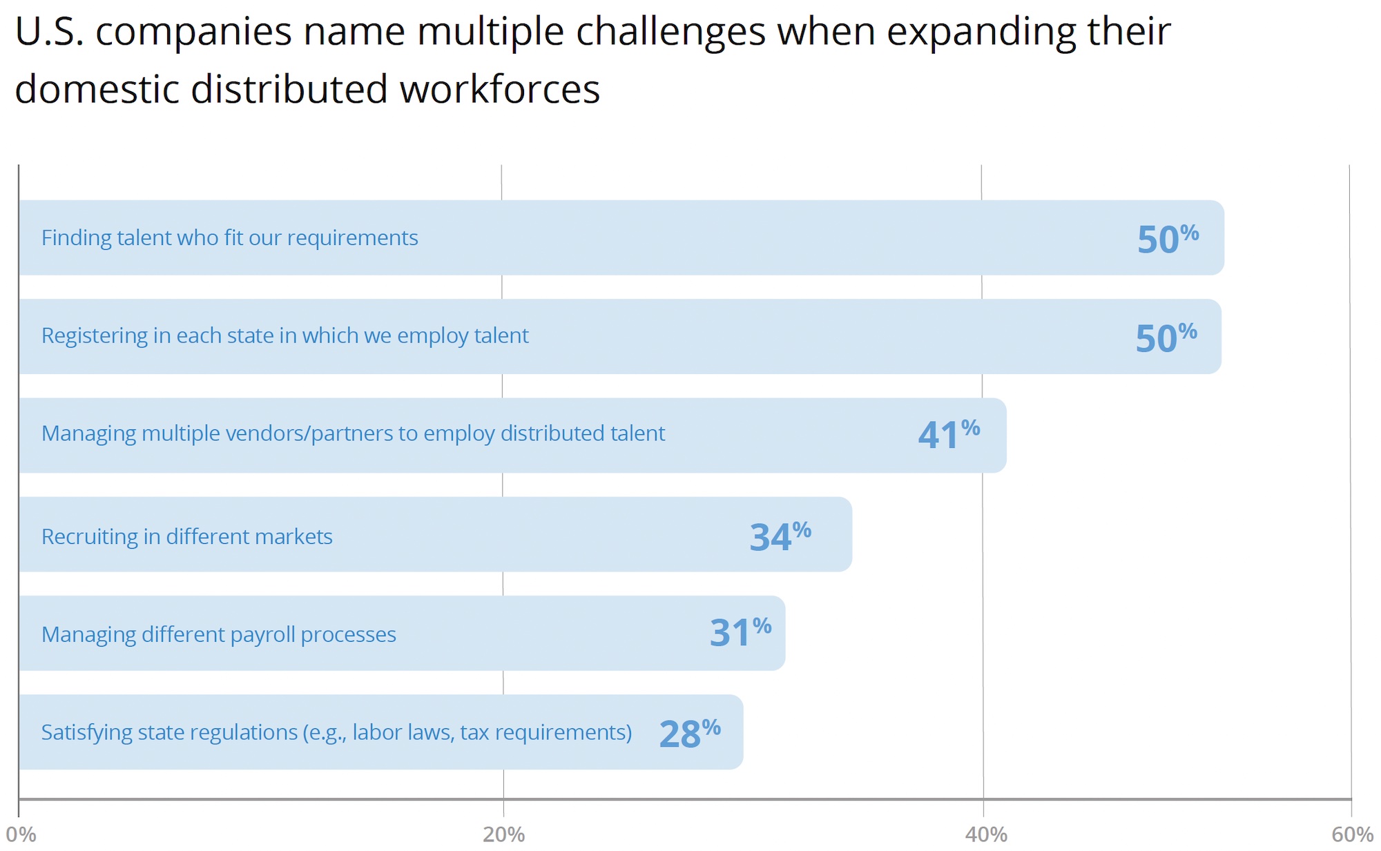 These decision-makers cite several forces that challenge their ability to grow their distributed workforce domestically and internationally, particularly among U.S. companies. Ninety-three percent of U.S. tech leaders say they do not have plans to expand their domestic distributed workforce. They point to recruiting, legal registrations in other states, and managing multiple vendors among other challenges.