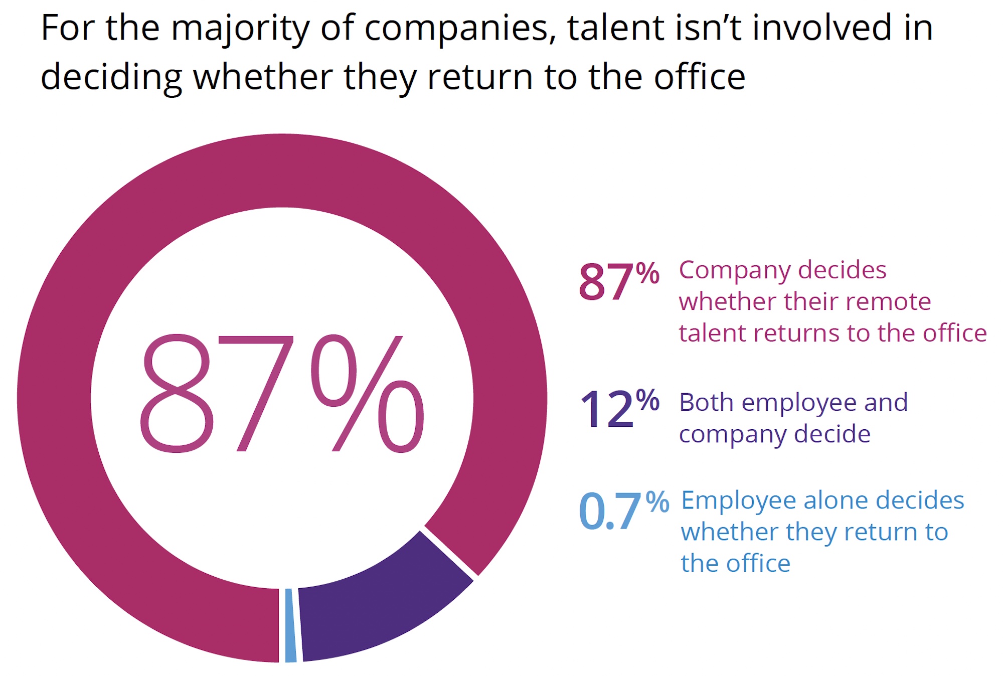One factor contributing to that discord is the lack of involvement of talent in the decision to return to the office. Eighty-seven percent of organization leaders say their company decides whether remote talent transitions back to working at a company-owned office, as opposed to it being a joint decision. Only 12% report that both the company and talent make that determination.