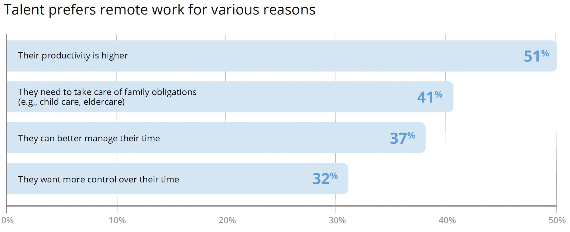 Respondents indicate talent prefers remote work for similar reasons, reinforcing the mutual benefits.