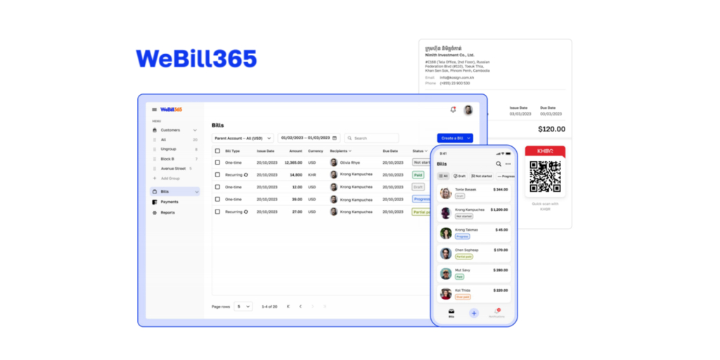 WeBill365 is a solution to automate complicated payment billing and acceptance operations for Cambodian businesses. It was launched for large-scale B2C businesses handling operations to bill and receive tuitions, building rentals and communication service fees, etc. Businesses can create virtual accounts and send bills to a large number of customers with a single click, and customers can conveniently make payments using their mobile devices by scanning the KHQR (universal QR platform for Cambodia) issued through text messages, emails, and Telegram.