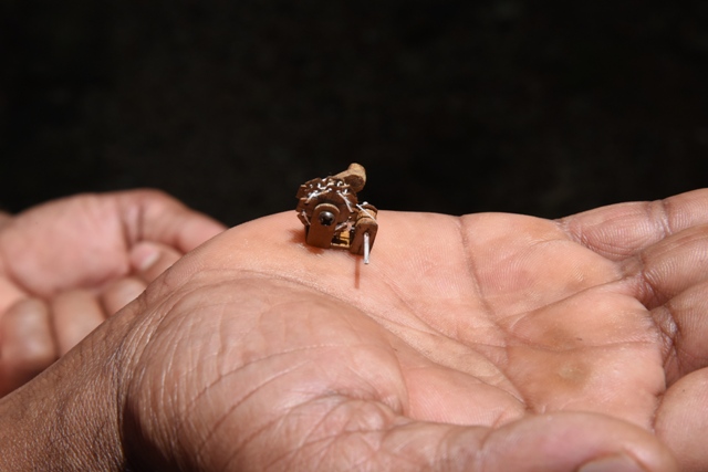 The charka with 1.8 cm in length, 1.5 cm in height and 1.1 cm in width has been made using the flakes of teak wood.