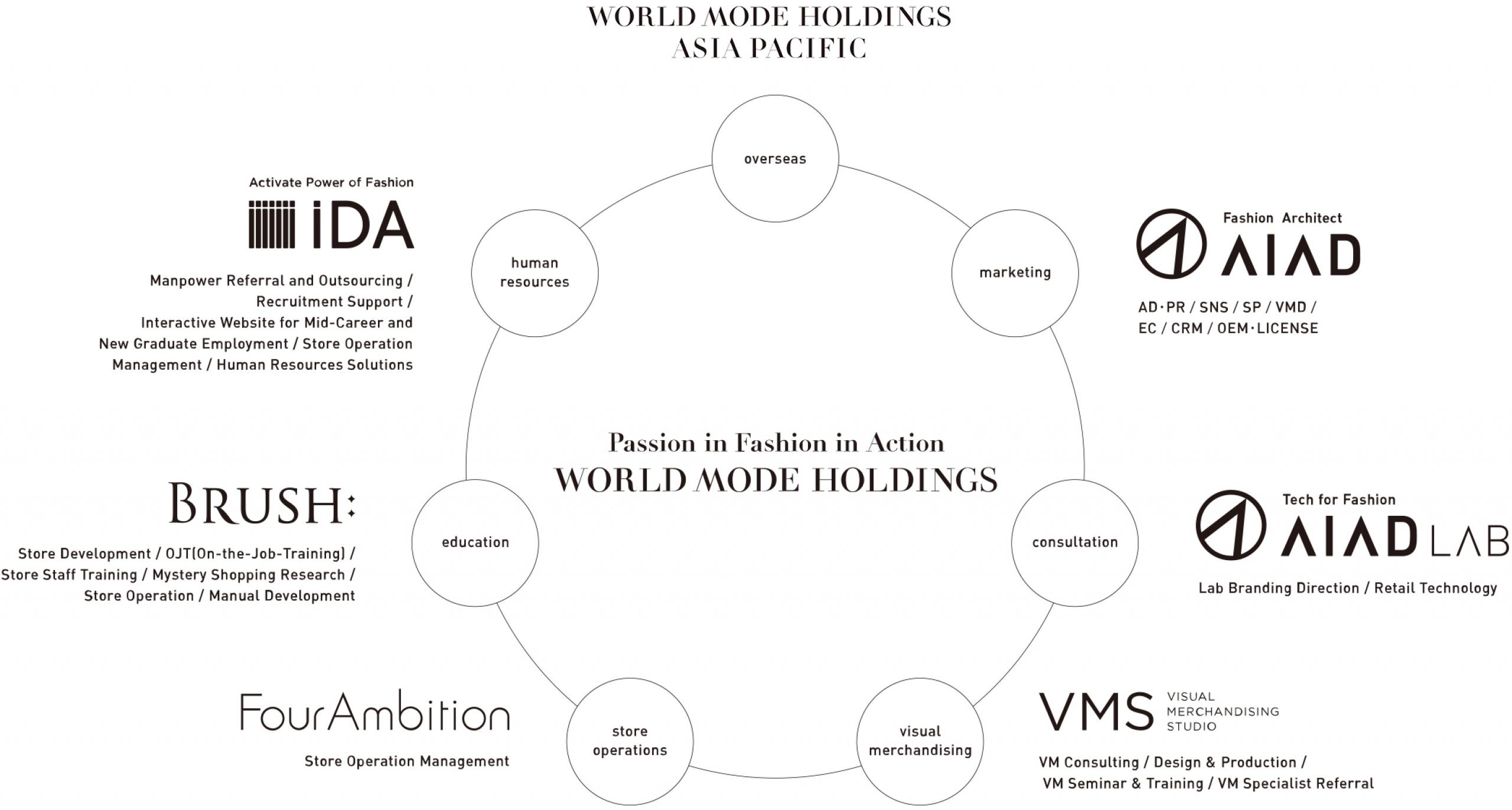 Established in 2012, World Mode Holdings Inc. (WMH) is a one-stop consultancy for retailers in the fashion and luxury brand industry. There are six business pillars under WMH Group’s wide-ranging consultancy expertise, namely iDA, BRUSH, Four Ambition, AIAD, AIAD LAB, and Visual Merchandising Studio. Each specializes in different service streams, including recruitment, training, store operations, digital marketing, e-commerce, CRM, retail technology and visual merchandising.